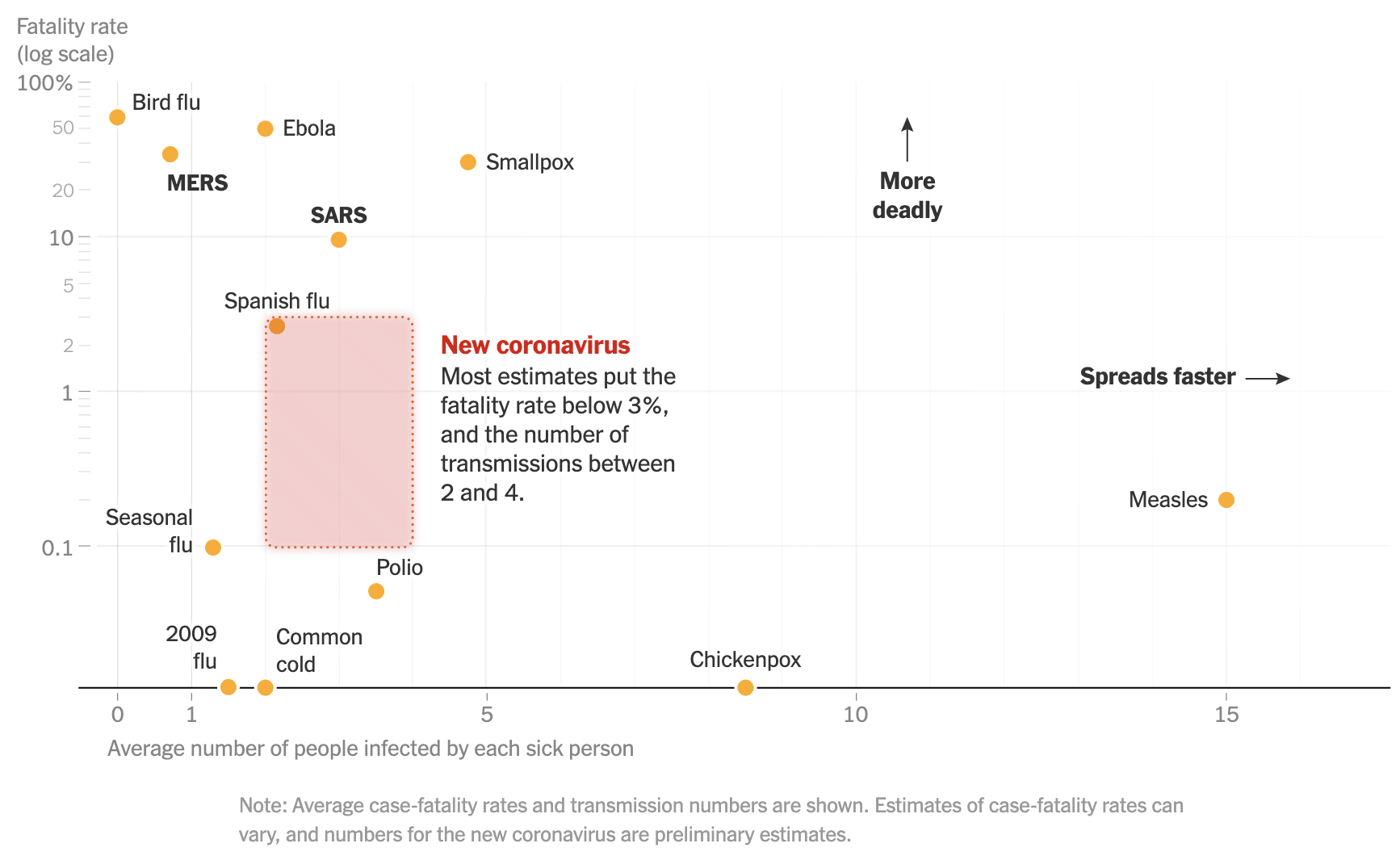 Figure 4: How the new coronavirus (SARS-CoV-2) compares with other infectious diseases. Image credit: (New York Times)