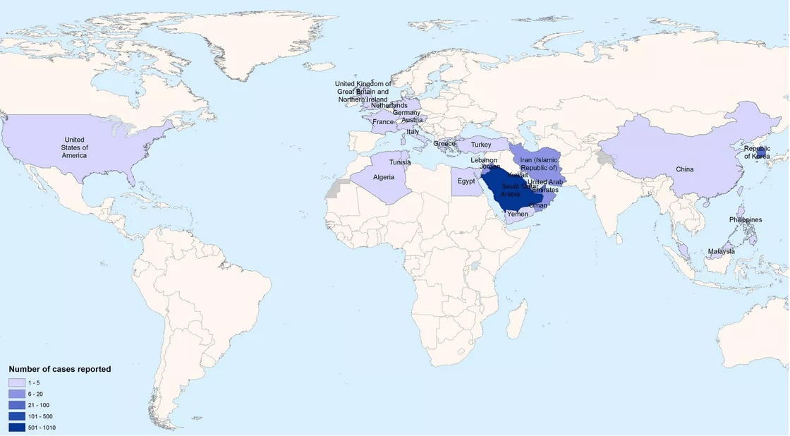 Figure 2. World diffusion of MERS-CoV pandemic in 2012 originating from the Middle East. Confirmed cases from 2012-2013. Image credit: Vox.com