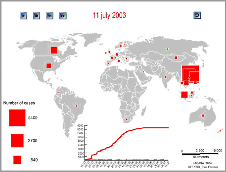 Figure 1. World diffusion of SARS-CoV-1 pandemic in 2003 seeing transmission from Asia to rapid growth in Canada. Image credit: (Banos and Lacasa., 2007)