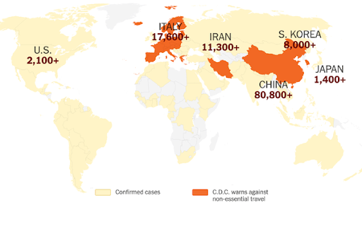 Figure 3. World diffusion (ongoing) of SARS-CoV-2 pandemic of 2020 originating in Wuhan, of Central Hubei province, China. Image credit: (The New York Times)