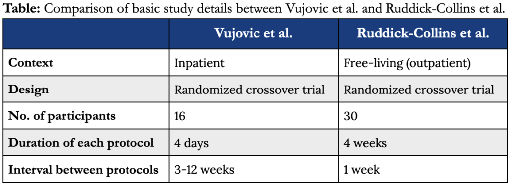 A comparison of select details from both studies is presented in the table below. Note that, though both studies had fairly small cohorts, they employed a robust randomized crossover trial design, and both provided the food and beverages that the participants consumed.