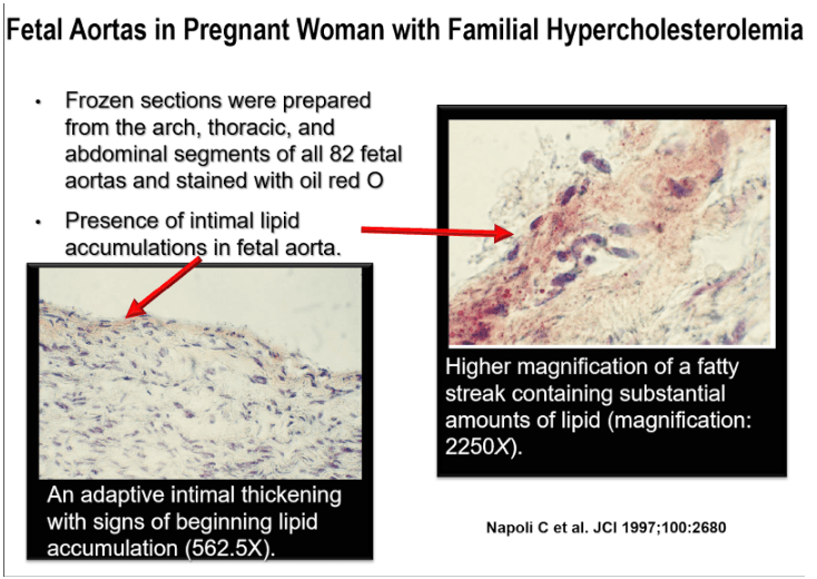 Tom’s addendum on how early this can start There are fetal autopsy studies in mothers who have familial hypercholesterolemia, and when they look at the little fetus’ heart, they actually see the beginning of plaque development