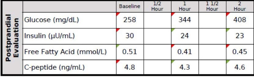 You don’t have to read these for a living to see this isn’t ideal. As you can see, his fasting glucose was 258 mg/dL and his fasting insulin, 30 uU/mL. When given 75 g of glucose, his glucose rose to 344 mg/dL at 60 minutes and 408 mg/dL at 120 minutes, all the while his insulin level fell from 30 to 24 to 23. These numbers alone confirm the diagnosis of T2D. But if we needed more evidence, his HbA1C was 9.7%, corresponding to an average blood glucose of 232 mg/dL (today the diagnosis of T2D is defined by HbA1C >= 6.5%, but I much prefer to use OGTT).