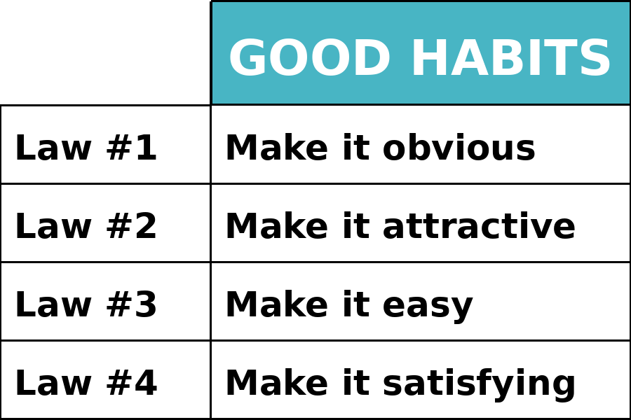The key to James’s advice is to follow four “laws” to incorporate an action into your routine so that it becomes a habit: 1) Make it obvious; 2) Make it attractive; 3) Make it easy; and 4) Make it satisfying.