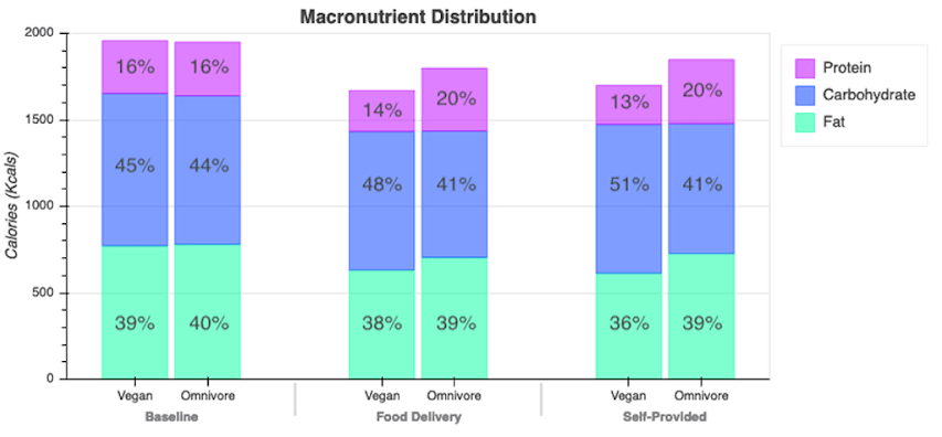 A “diet” is defined by many variables: total calorie intake, macronutrient/micronutrient composition, meal timing, ratio of calories from liquid vs. solid foods, and so on. Even during the first 4-weeks in which all meals were provided, neither total calorie intake nor nutrient composition was controlled between diet groups (see figure below). The vegan group consumed approximately 200 fewer calories per day (~11% of daily calories) than the omnivore group (1628±519 vs 1815±623 kcal/day). Further, despite roughly similar fat content in the diet, fat composition differed dramatically between groups, with the omnivore group consuming far more saturated fat than the vegan group in both study phases (calories from saturated fat: 130±54 vs. 186±100 kcal for vegan vs. omnivore in phase 1; 129±82 vs. 209±112 in phase 2). These differences could easily mean that the increased weight loss and greater reduction in LDL-C relative to baseline among vegan participants were the results of lower intake of total calories and saturated fat rather than to a vegan diet per se.