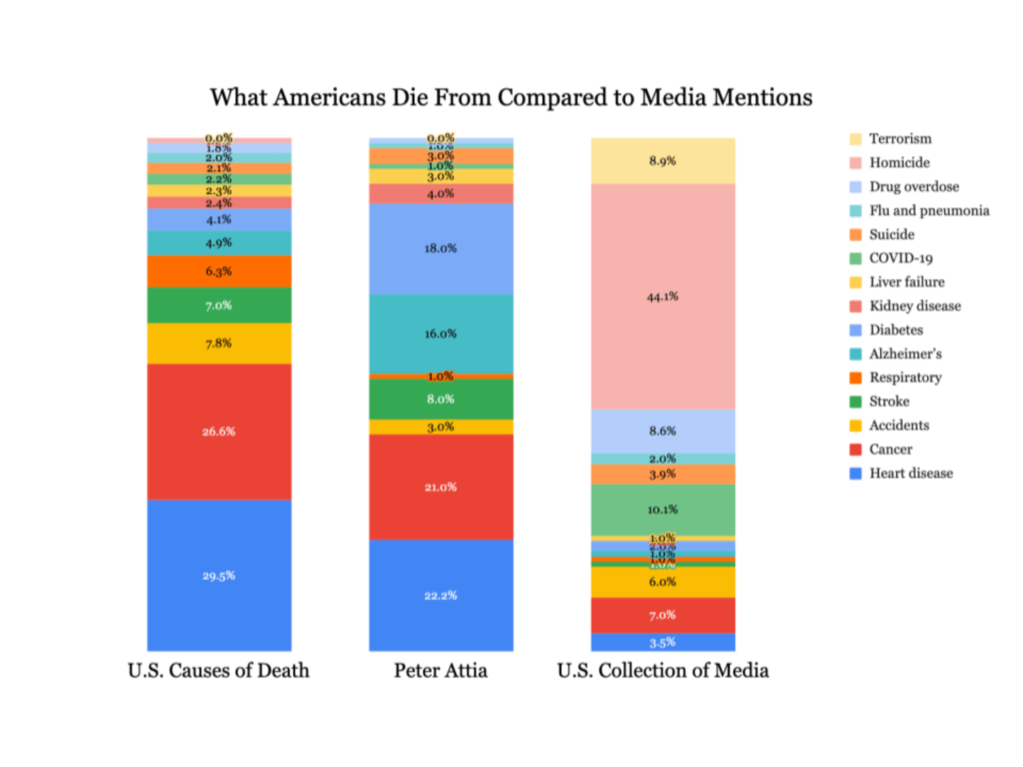 But our goal is different from that of many media outlets. We aim to empower individuals with information that they can use to protect themselves from far more predictable—and far more likely—causes of death. Heart disease, cancer, and chronic metabolic or neurodegenerative diseases aren’t random events; they’re shaped by choices, environments, risk factors, and systems we can understand and improve. Prioritizing what’s most impactful for long-term health and lifespan often comes at a cost to us—reminding folks to exercise and keep up with cancer screenings doesn’t exactly make for great click-bait—but we began this enterprise as a humble attempt to help our audience improve their health, and that’s how we intend to continue it. Indeed, where our coverage does diverge from real mortality statistics, it is typically because we are choosing to focus on the most modifiable factors—changes you can make to shape your health.