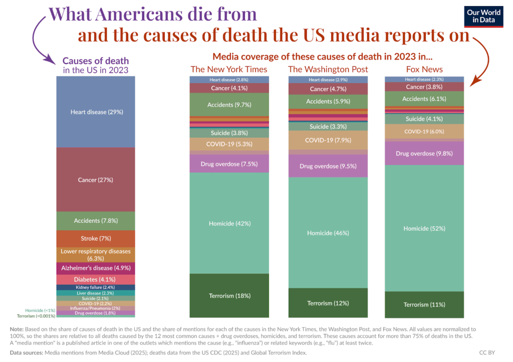 The article, “Does the news reflect what we die from” takes an investigative look at how the media’s attention aligns with reality.1 The authors examined the twelve leading causes of death in the U.S. in 2023, then added homicide, drug overdoses, and terrorism—topics that often dominate headlines despite their relatively small toll. Together, these categories accounted for roughly 76% of all U.S. deaths that year. To see how media coverage stacked up against actual causes of death, they performed an automated keyword search across stories from major national outlets, including The New York Times, The Washington Post, and Fox News.